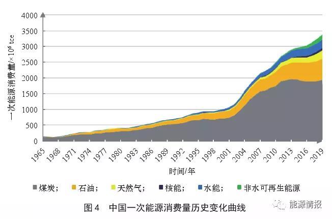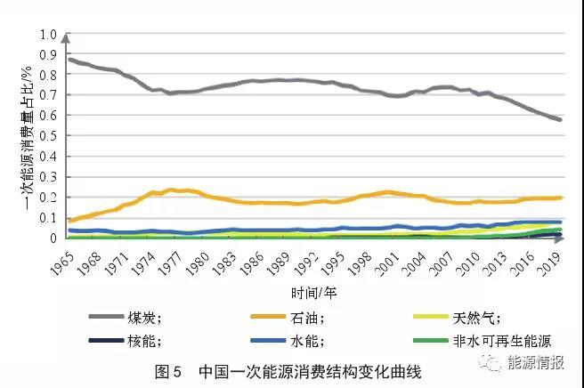 1965—2019 年,一次能源消費(fèi)量(見圖 4)及消費(fèi)結(jié)構(gòu)(見圖 5)的變化情況顯示:我國一次能源消費(fèi)量從 1.87×108 tce 增長到 4.83億tce,年均增長率為 6.25%;而能源相關(guān) CO2排放量則從 4.89億t 增加到 98.3億t,年均增長率為 5.74%;在此期間,煤炭始終占據(jù)能源主力位置,但占比從87.0%下降至 57.4%。