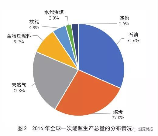 重塑世界能源體系需要各個國家共同努力和協(xié)作應(yīng)對,促使能源體系發(fā)生重大的根本性變革。盡管清潔能源、綠色能源的概念逐步被認(rèn)識并看好,但是化石能源的主導(dǎo)地位到目前為止依舊沒有出現(xiàn)明顯的減弱跡象。根據(jù)國際能源署(IEA)統(tǒng)計(jì)數(shù)據(jù)顯示(見圖 2),2016 年全球煤炭、石油、天然氣三大傳統(tǒng)化石能源占一次能源生產(chǎn)總量的比例高達(dá) 81.4%,仍居于絕對的核心和主導(dǎo)地位。
