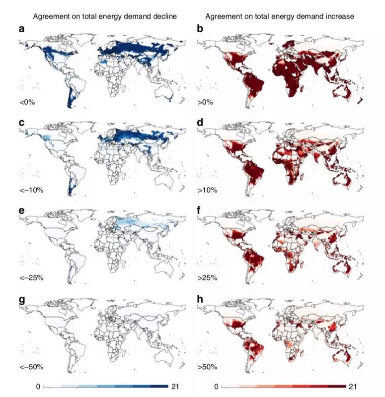 該研究使用計量經(jīng)濟的方法評估能源需求與人均收入、冷熱天數(shù)的響應(yīng),考慮2050年左右的平均氣溫的上升,推算出全球變暖使得全球能源需求在2050年左右增加了25-58%(在較溫和的溫升情況下也會增加11-27%),而能源需求由于社會經(jīng)濟、人口發(fā)展本身到2050年也將增長1.7-2.8倍。在美國,歐洲和中國的熱帶和南部地區(qū)的能源需求將因為氣候變暖增長超過25%。