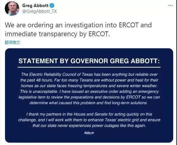 得州州長格雷格·雅培也表示,私人運(yùn)營商負(fù)責(zé)的環(huán)節(jié)出了問題,與州政府無關(guān)。他甚至下令對得州電力可靠性委員會開展調(diào)查。