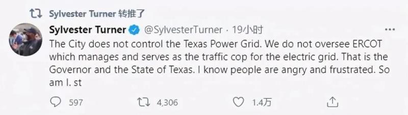 休斯敦市長西爾維斯特·特納發(fā)推表示:“市政府并不能控制得克薩斯的電網(wǎng)。我們也不能監(jiān)督得州電力可靠性委員會。而監(jiān)督該委員會的責(zé)任,那是州長和州政府、州議會的事兒?!?