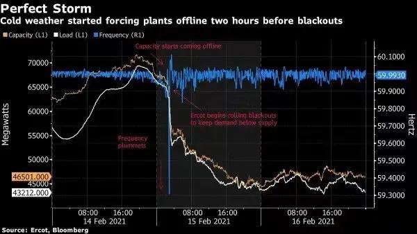 看兩張圖。彭博社展示的得州電網(wǎng)負(fù)荷與電網(wǎng)頻率曲線圖,足以讓全世界的電力從業(yè)者驚出一身冷汗。