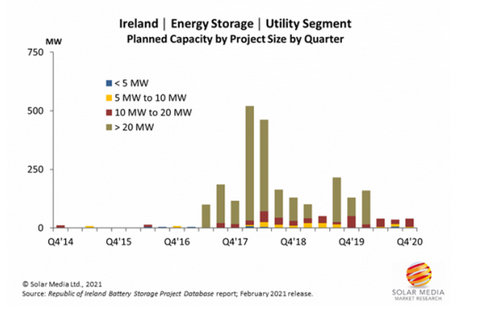 上圖顯示了在過(guò)去幾年中,愛(ài)爾蘭的電網(wǎng)規(guī)模電池儲(chǔ)能項(xiàng)目的管道增長(zhǎng)25%。第一個(gè)電網(wǎng)規(guī)模的電池儲(chǔ)能項(xiàng)目(高于20MW)于2017年提交部署規(guī)劃。