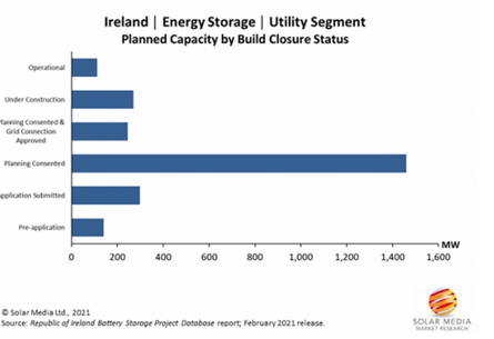 規(guī)劃中的項(xiàng)目計(jì)劃凸顯了愛(ài)爾蘭對(duì)電網(wǎng)規(guī)模電池儲(chǔ)能市場(chǎng)的更多興趣,這超出了DS3 (提供安全可持續(xù)的電力系統(tǒng))計(jì)劃的最初推動(dòng)。在2021年,關(guān)鍵部門的利益相關(guān)者將密切關(guān)注即將推出的DS3計(jì)劃,同時(shí)尋求替代的市場(chǎng)途徑,其中包括容量市場(chǎng)和商戶交易(在英國(guó)和歐洲其他國(guó)家都有這樣的交易)。