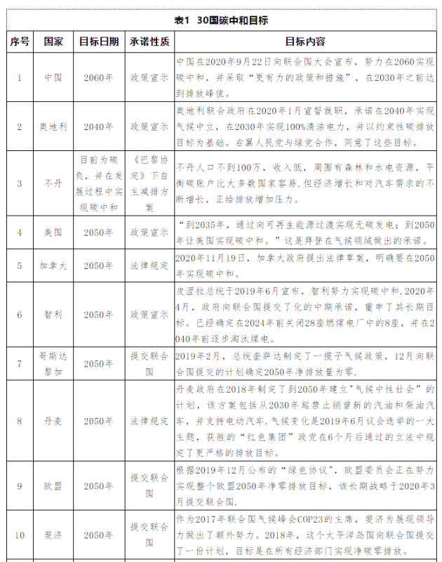 國(guó)際能源網(wǎng)通過(guò)數(shù)據(jù)整理發(fā)現(xiàn),截止目前,已經(jīng)有30個(gè)國(guó)家明確提出了碳排放目標(biāo)。具體詳見(jiàn)表1 30國(guó)碳中和目標(biāo)。