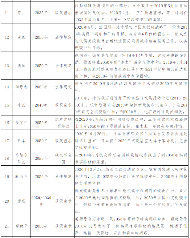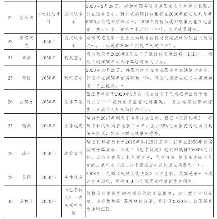 英國(guó)、歐盟、法國(guó)、德國(guó)、美國(guó)、日本、韓國(guó)、加拿大、南非等22個(gè)國(guó)家把實(shí)現(xiàn)碳中和的目標(biāo)年份定在2050年。而烏拉圭(2030年)、芬蘭(2035年)、冰島(2040年)、奧地利(2040年)、瑞典(2045年)5國(guó)的碳中和目標(biāo)年份是2030年-2045年,其中半數(shù)是北歐國(guó)家。新加坡則承諾將在本世紀(jì)下半葉盡快實(shí)現(xiàn)凈零排放。