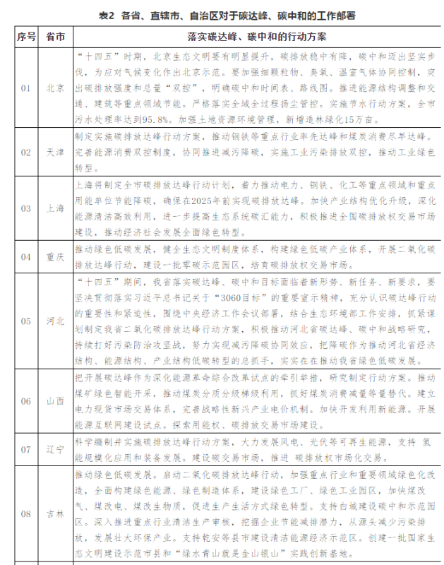 在省級(jí)層面,上海、福建、海南、青海等地提出在全國(guó)達(dá)峰之前率先達(dá)峰,天津、上海、河北、山西、江蘇、安徽、福建、江西、山東、河南、陜西、遼寧、湖北、海南、四川、甘肅、西藏共17個(gè)省、直轄市、自治區(qū)提出2021年將研究、制定實(shí)施二氧化碳排放達(dá)峰行動(dòng)方案。各地2021年政府工作報(bào)告中對(duì)于實(shí)現(xiàn)碳達(dá)峰的詳細(xì)部署工作見(jiàn)下表2.