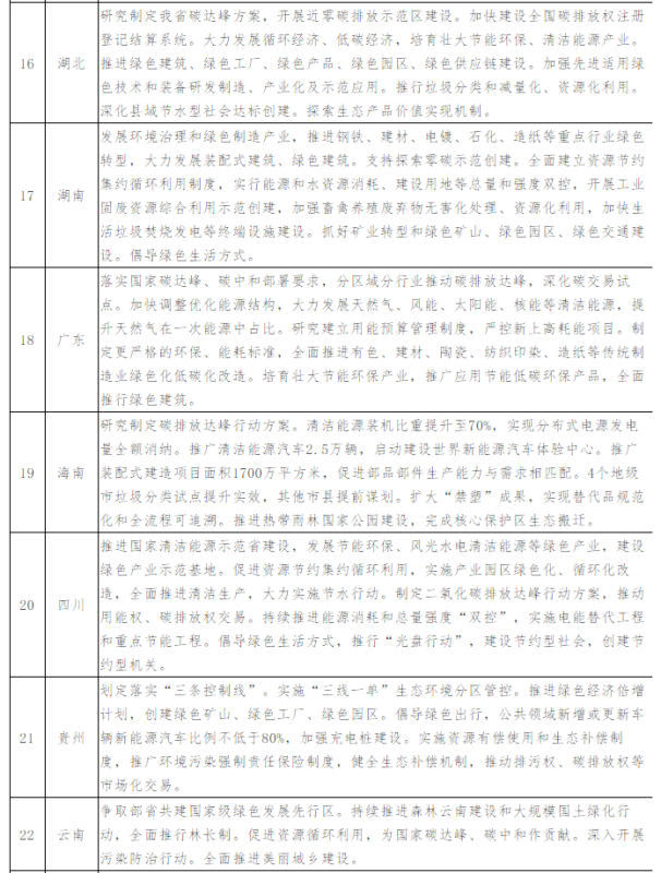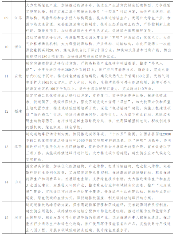 針對(duì)不同區(qū)域的局勢(shì)差異,各省都有一些特色措施。如黑龍江、江西等地以碳市場(chǎng)建設(shè)助力碳達(dá)峰碳中和;上海、貴州在公共領(lǐng)域全面推廣新能源汽車,推進(jìn)充電樁、換電站、加氫站建設(shè),倡導(dǎo)低碳綠色出行;山西推動(dòng)煤礦綠色智能開(kāi)采,推動(dòng)煤炭分質(zhì)分級(jí)梯級(jí)利用;浙江開(kāi)展低碳園區(qū)建設(shè)和“零碳”體系試點(diǎn);天津加快建設(shè)能源互聯(lián)網(wǎng),推動(dòng)構(gòu)建以電為中心的現(xiàn)代能源體系等。