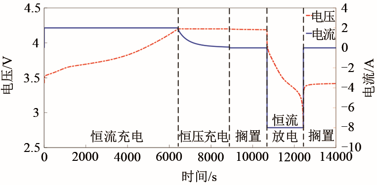 容量衰退實(shí)驗(yàn)完成后共得到四組電池單體全壽命循環(huán)測試數(shù)據(jù),分別標(biāo)號為電池A-1、電池B-2、電池B-3、電池B-4,其中電池A-1為A型號鋰電池,其它3組為B型號鋰電池。以電池A-1為例,某一循環(huán)的容量衰退實(shí)驗(yàn)電壓與電流變化如圖2所示,每個(gè)測試循環(huán)均由恒流充電、恒壓充電、擱置、恒流放電、擱置等5部分組成,其中A型號恒流充電過程電流大小為2 A,B型號為1.275A,A型號恒壓充電過程截止電流為80 mA,B型號為51 mA,A型號恒流放電過程電流為8 A,B型號為5.1 A。