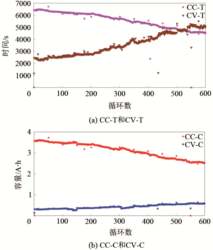第一類為根據(jù)傳感器直接采集數(shù)據(jù)獲得的特征量。分別將恒流充電階段的充電時(shí)間CC-T、充電容量CC-C、恒壓充電階段的充電時(shí)間CV-T、充電容量CV-C作為特征量。以電池A-1為例,所提取的第一類特征量如圖3所示。