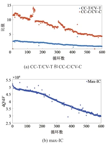 式中,Vt代表t時(shí)刻的電池端電壓。在恒流充電模式下,電流為恒定值,當(dāng)取極小的時(shí)間間隔圖片時(shí),式(1)是成立的,由此可以快速繪制出IC曲線。繪制的IC曲線如圖4所示,濾波后,可見曲線呈現(xiàn)明顯的峰值特征。將每一循環(huán)IC曲線的最大值作為第二類特征量,稱為:Max-IC。此外,分別取恒流階段充電時(shí)間與對應(yīng)循環(huán)恒壓階段充電時(shí)間的比值:CC-T/CV-T和恒流階段充電容量與對應(yīng)循環(huán)恒壓階段充電容量的比值:CC-C/CV-C作為第二類相關(guān)特征量。電池A-1的第二類特征量如圖5所示。