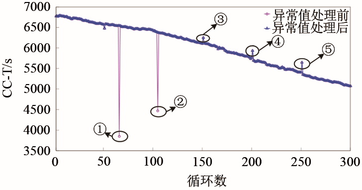 式中,NK(p)表示點(diǎn)p的k距離鄰域,點(diǎn)o為鄰域內(nèi)的某一點(diǎn);lrdk(p),lrdk(o)分別表示點(diǎn)p與點(diǎn)o的局部可達(dá)密度。局部離群因子越接近1,說明點(diǎn)p與其鄰域點(diǎn)的周圍密度相差無幾,p和鄰域同屬一簇的概率越高,反之,p點(diǎn)可能是異常點(diǎn)。圖6顯示了應(yīng)用局部離群因子甄別A型號電池特征量CC-T中異常離群點(diǎn)結(jié)果,原始數(shù)據(jù)中點(diǎn)1~5均是明顯可見的離群點(diǎn),其中,點(diǎn)1和點(diǎn)2是由于測試環(huán)境所造成的異常值,需要進(jìn)行平滑處理,而點(diǎn)3~5處數(shù)值的變化是電池的可用容量回升現(xiàn)象在特征量CC-T中的反映,不能一并進(jìn)行平滑處理,在特征選擇的過程中應(yīng)將其予以保留。