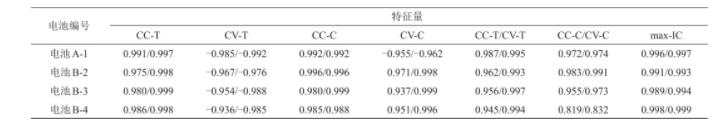 實(shí)驗(yàn)所得四組電池的循環(huán)放電容量與相應(yīng)特征量之間的斯皮爾曼等級相關(guān)系數(shù)如表2所示,表中列出了經(jīng)過異常離群點(diǎn)處理前后的相關(guān)性系數(shù)。結(jié)果顯示,所提取的特征量與對應(yīng)的剩余可用容量之間相關(guān)系數(shù)均在0.9左右,呈現(xiàn)出強(qiáng)相關(guān)性。且經(jīng)LOF算法處理異常離群點(diǎn)之后,相關(guān)性系數(shù)均有提高,顯著的增強(qiáng)了特征向量與對應(yīng)循環(huán)容量之間的相關(guān)性。