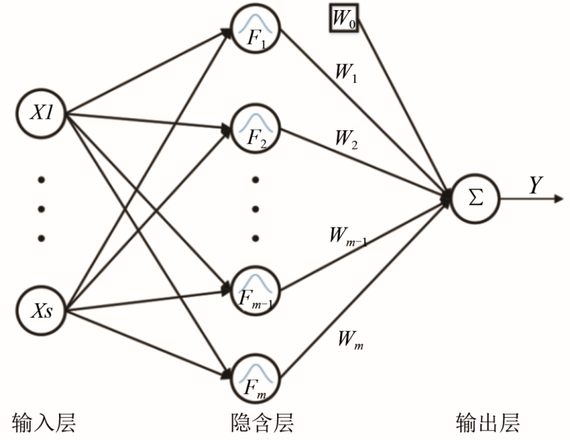 式中,x為s維輸入向量;ci為第i個(gè)徑向基函數(shù)的中心;δi為第i個(gè)神經(jīng)元感知范圍,其決定該基函數(shù)的中心寬度;m為隱含層神經(jīng)元的個(gè)數(shù);||x-ci||表示x和ci之間的歐氏距離。Y為網(wǎng)絡(luò)的輸出向量。