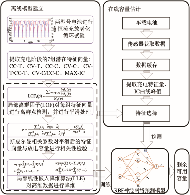 鋰電池剩余可用容量估計(jì)流程如圖9所示,主要分為離線估算模型建立和在線容量估計(jì)兩部分。在離線階段,對測得的鋰電池循環(huán)充放實(shí)驗(yàn)數(shù)據(jù)進(jìn)行預(yù)處理,作為RBF神經(jīng)網(wǎng)絡(luò)的訓(xùn)練數(shù)據(jù)集。從充電階段的時(shí)間、電壓、電流、容量、IC曲線中提取出一系列特征向量,通過局部離群因子法剔除特征向量中異常離群點(diǎn),消除環(huán)境噪聲對特征量的干擾,并采用斯皮爾曼相關(guān)系數(shù)檢驗(yàn)平滑后特征量與容量之間的相關(guān)性。利用局部線性嵌入法對多維特征量進(jìn)行降維,減小數(shù)據(jù)的復(fù)雜程度,提高模型的訓(xùn)練效率。最后,訓(xùn)練RBF網(wǎng)絡(luò)中的內(nèi)部參數(shù),確定容量估算模型。在線部分采用與離線階段相同的方式對數(shù)據(jù)進(jìn)行預(yù)處理之后作為模型輸入,訓(xùn)練良好的估算模型輸出高效準(zhǔn)確的容量估計(jì)值。