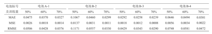 由圖10中可以看到,當(dāng)訓(xùn)練數(shù)據(jù)量增加至70%時(shí),模型的預(yù)測精度有所提高,最大MAE為0.0381,最大MSE為0.0022,最大RMSE為0.0472。當(dāng)訓(xùn)練數(shù)據(jù)量減少至50%時(shí),模型的估算精度只有略微降低,其中電池B-2的預(yù)測誤差較大,最大MAE為0.1067,最大MSE為0.0137,最大RMSE為0.1171,其他電池的預(yù)測精度與在60%訓(xùn)練數(shù)據(jù)下的預(yù)測結(jié)果相差無幾。表明所提出的估算模型有良好的泛化能力和較強(qiáng)的魯棒性,能夠在數(shù)據(jù)有所波動的情況下有效估計(jì)不同類型電池的可用容量。