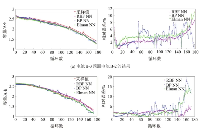 與具有循環(huán)結(jié)構(gòu)的Elman神經(jīng)網(wǎng)絡(luò)和傳統(tǒng)的BP神經(jīng)網(wǎng)絡(luò)相比較,Elman神經(jīng)網(wǎng)絡(luò)對電池B-2和電池B-3的容量預(yù)測結(jié)果整體亦在6%左右,最大MAE為0.0847,最大RMSE為0.0874,BP神經(jīng)網(wǎng)絡(luò)模型的預(yù)測結(jié)果中相對誤差多數(shù)均大于6%,最大MAE為0.0723,最大RMSE為0.0869,而RBF神經(jīng)網(wǎng)絡(luò)模型對兩電池容量預(yù)測結(jié)果的最大MAE為0.0612,最大RMSE為0.0570,在預(yù)測精度和模型穩(wěn)定方面均體現(xiàn)出良好的實(shí)際使用優(yōu)勢。
