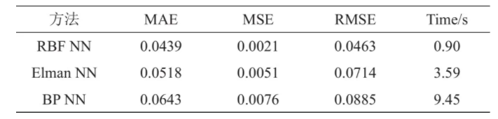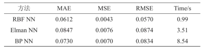 此外,由表4可知,在相同的運(yùn)算處理?xiàng)l件下,在預(yù)測電池B-2的容量時(shí),RBF神經(jīng)網(wǎng)絡(luò)所消耗的時(shí)間僅為0.99 s,Elman神經(jīng)網(wǎng)絡(luò)消耗時(shí)間為3.5 s,BP神經(jīng)網(wǎng)絡(luò)表現(xiàn)最差,消耗時(shí)間為8.5 s。根據(jù)表5可知,在預(yù)測電池B-3的容量時(shí),RBF神經(jīng)網(wǎng)絡(luò)所消耗的時(shí)間為0.9 s,Elman神經(jīng)網(wǎng)絡(luò)消耗時(shí)間為3.5 s,BP神經(jīng)網(wǎng)絡(luò)則高達(dá)9.4 s。對比三種預(yù)測模型,可以看出本文所提出的剩余可用容量估算方法所消耗的時(shí)間分別約為Elman神經(jīng)網(wǎng)絡(luò)和BP神經(jīng)網(wǎng)絡(luò)的1/5和1/10,顯示出較大的效率優(yōu)勢。
