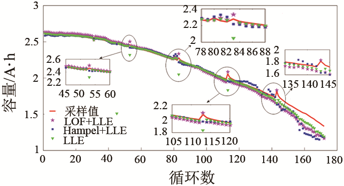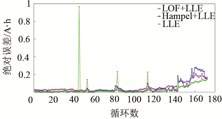 結(jié)果顯示,未經(jīng)處理的特征量經(jīng)LLE算法降維之后輸入RBF模型,其容量預(yù)測結(jié)果精度較差,最大誤差接近1 A·h,且結(jié)果分布較為分散,這說明不對異常值進(jìn)行處理,神經(jīng)網(wǎng)絡(luò)模型不能有效學(xué)習(xí)到特征量與容量之間的映射關(guān)系,得不到理想的預(yù)測結(jié)果。經(jīng)Hampel濾波器平滑后的特征量在輸入模型后對剩余可用容量估計(jì)的誤差整體在0.2 A·h以內(nèi),但是,在電池循環(huán)壽命后期的估算效果較差。經(jīng)LOF算法處理后的特征數(shù)據(jù)對應(yīng)的容量估計(jì)誤差則保持在0.2 A·h以內(nèi)。