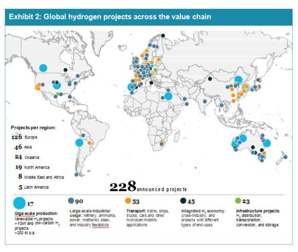 目前,在全球范圍內(nèi),價(jià)值鏈上有228個(gè)氫項(xiàng)目,85%的全球項(xiàng)目來自歐洲、亞洲和澳大利亞,美洲、中東和北非正在加速部署。