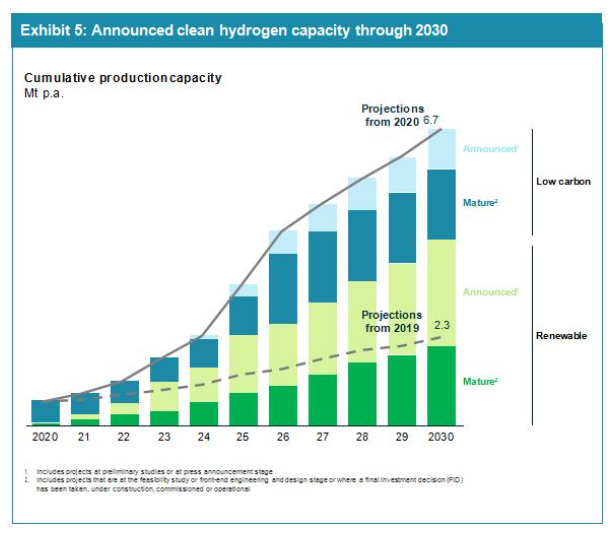 在這些項(xiàng)目中有17個(gè)GW級項(xiàng)目(即可再生能源超過1GW,每年可產(chǎn)20萬噸低碳?xì)洌?,其中最大的?xiàng)目在歐洲、澳大利亞、中東和智利。