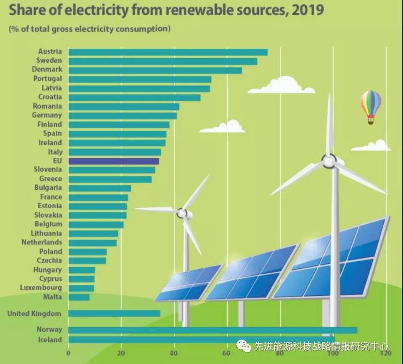 圖2 2019年歐盟整體和成員國電力消費(fèi)總量中可再生能源占比情況