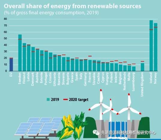 盡管整體發(fā)展情況較好,但各成員國的發(fā)展情況不一。2019年,瑞典可再生能源在其終端消費(fèi)總量中的占比超過一半,達(dá)到56.4%,是歐盟成員國中占比最高的國家,緊隨其后的是芬蘭(43.1%)、拉脫維亞(41.0%)、丹麥(37.2%)和奧地利(33.6%)。從設(shè)定的國家目標(biāo)來看,有14個(gè)成員國已經(jīng)超過了原先設(shè)定的2020年發(fā)展目標(biāo);六個(gè)國家已接近目標(biāo),其中德國(17.4%)低了0.6個(gè)百分點(diǎn);而法國(17.2%,比目標(biāo)低5.8個(gè)百分點(diǎn))、荷蘭(8.8%,低5.2個(gè)百分點(diǎn))、及愛爾蘭(12%,低4.0個(gè)百分點(diǎn))和盧森堡(7%,低4.0個(gè)百分點(diǎn))可再生能源發(fā)展嚴(yán)重滯后于設(shè)定的國家目標(biāo)。