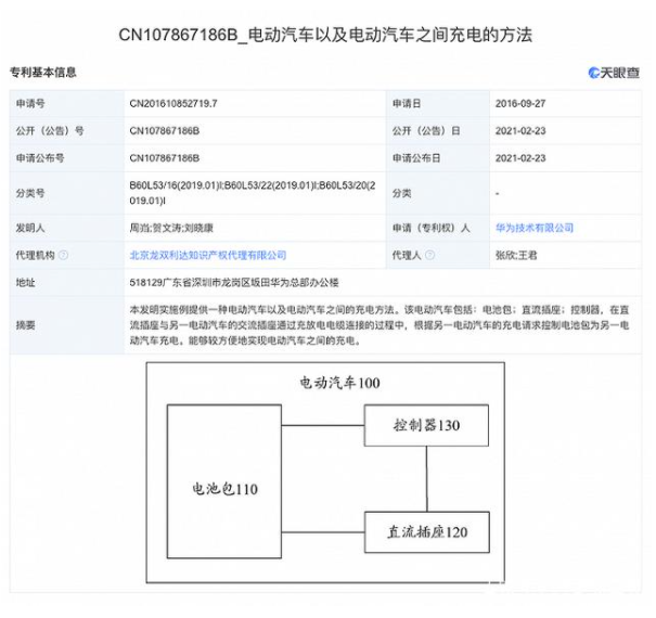 中國(guó)儲(chǔ)能網(wǎng)訊:2月24日,華為技術(shù)有限公司對(duì)外公布了一項(xiàng)“電動(dòng)汽車(chē)以及電動(dòng)汽車(chē)之間充電的方法”專(zhuān)利技術(shù),專(zhuān)利公開(kāi)號(hào)為CN107867186B,申請(qǐng)日期為2016年9月27日。