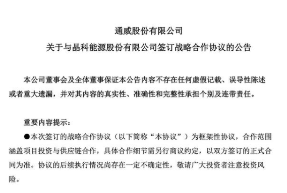 為確保硅料供給,通威股份也選擇“抱團(tuán)”,宣布擬與晶科能源簽署《戰(zhàn)略合作協(xié)議》。