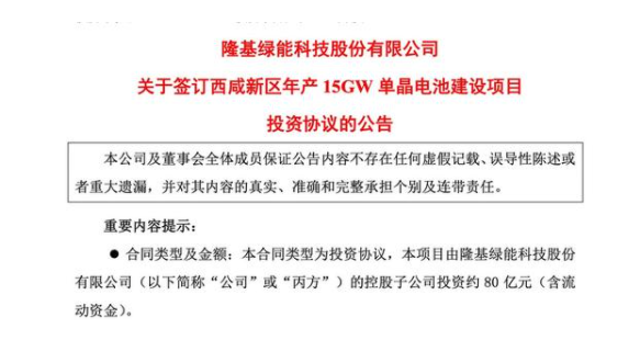 1月19日,隆基股份發(fā)布公告稱(chēng),將投資80億元在陜西西咸新區(qū)建設(shè)年產(chǎn)15GW單晶電池項(xiàng)目。