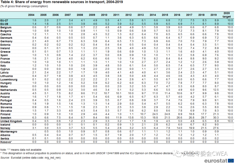 各國的增長情況:與2018年相比,2019年有22個(gè)歐盟成員國的運(yùn)輸行業(yè)可再生能源占比有所增加,其中芬蘭提升了3.6個(gè)百分點(diǎn)(+3.6pp),其次是克羅地亞(+3.3 pp)、荷蘭(+2.9 pp)和斯洛文尼亞(+2.5 pp)。EFTA成員國挪威增長了6.1個(gè)百分點(diǎn)(+6.1 pp)。參見表4。
