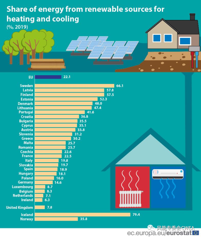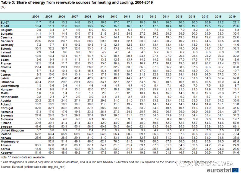 2019年,可再生能源占?xì)W盟27國供暖和制冷能源消費(fèi)量的22.1%,高于2004年的11.7%。工業(yè)、服務(wù)業(yè)和家庭在供熱和制冷方面的發(fā)展推動了這一增長。上述數(shù)據(jù)中已包括收集空氣熱能進(jìn)行加熱的熱泵、地?zé)崮芎退疅崮?。圖3顯示了可再生能源在供暖和制冷能源消耗中所占的份額。