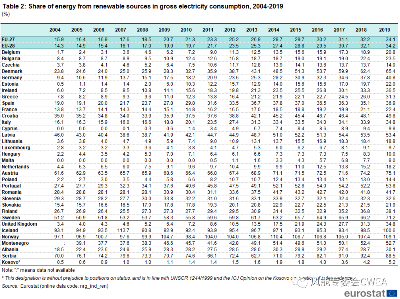 表1: 2004-2019終端能源中可再生能源占比 (%) 來源:Eurostat
