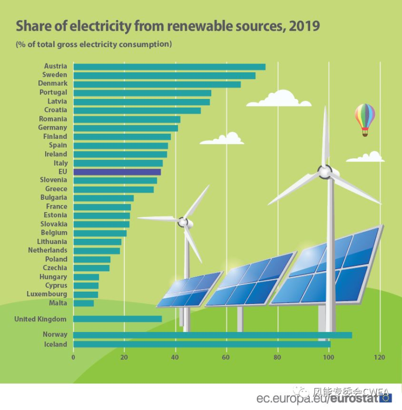 圖1 2019年歐盟和歐洲各國可再生能源占終端能源消費(fèi)總量的比重,來源:Eurostat
