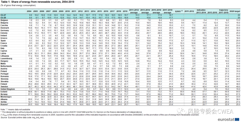 歐盟力爭到2020年將其可再生資源占終端能源消費(fèi)總量的比重提高到20%。該目通過在歐盟成員國之間分配,通過各國家行動計(jì)劃,旨在繪制每個(gè)成員國發(fā)展可再生能源的途徑。上圖顯示了可再生能源在終端能源消費(fèi)中所占比重的最新數(shù)據(jù),以及為2020年說設(shè)定的目標(biāo)。2019年歐盟27國可再生能源占終端能源消費(fèi)的比重攀升至19.7%,而2004年只占9.6%。