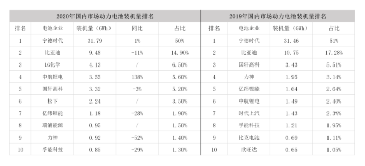 與2019年相比,2020年最大的變化就是LG化學(xué)與松下的闖入,二者也成為國內(nèi)市場(chǎng)裝機(jī)量增長最快的電池供應(yīng)商。另外實(shí)現(xiàn)裝機(jī)量增長的是中航鋰電和瑞浦能源,中航鋰電實(shí)現(xiàn)138%的增長,而瑞浦能源在2019尚未進(jìn)入前十榜單,去年則躍升為第8位。同時(shí),寧德時(shí)代仍穩(wěn)坐頭把交椅,裝機(jī)量實(shí)現(xiàn)1%的小幅上漲。