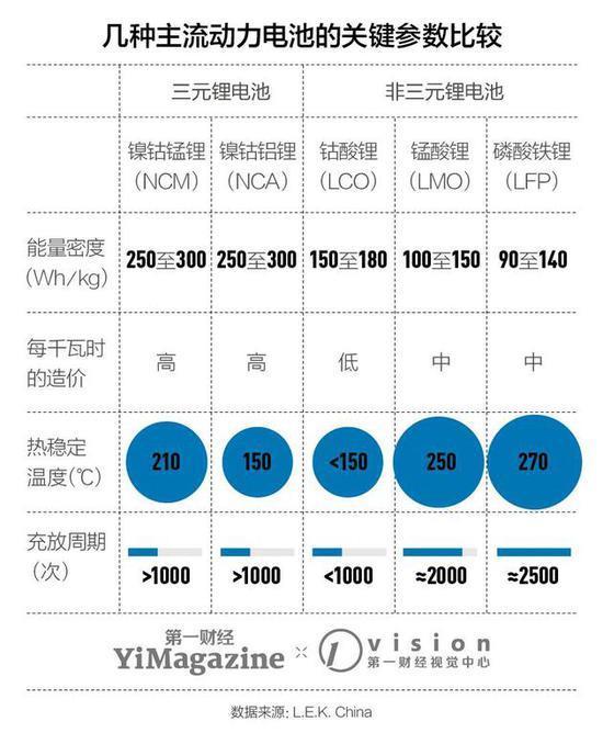 動力電池市場目前最常見的兩類解決方案,一是三元鋰電池,二是磷酸鐵鋰電池。兩者間的主要差異在于電芯正極材料所用的合金——磷酸鐵鋰方案安全性好、成本低,但能量密度不高;三元鋰方案能量密度高、耐低溫,但安全性差、成本高。