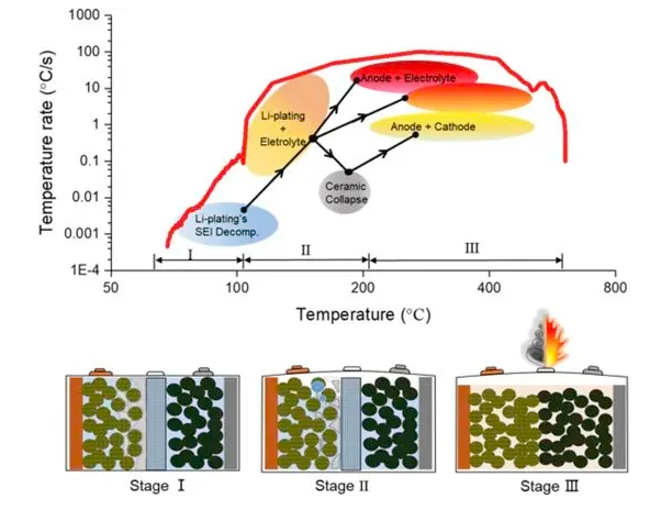 熱失控由一系列的鏈反應(yīng)引起。新鮮電池的熱失控通常是由短路引起的,隨后電解液發(fā)生反應(yīng),電池溫度達(dá)到最高。而快充后的電池?zé)崾Э剡^程可以分為三個階段,如圖10所示。第一階段(60℃ < T< 110℃),析出的鋰與電解液反應(yīng)加熱電池,SEI膜不斷破裂與再生,此時溫度相對較低。第二階段(熱失控誘發(fā)階段),鋰金屬在與電解液的反應(yīng)中被大量消耗,造成溫度急劇升高。隔膜收縮,正負(fù)極接觸。第三階段(熱失控至最高溫度),由于溫度突然升高,正負(fù)極與電解液及正負(fù)極之間開始發(fā)生反應(yīng)。最終電池溫度達(dá)到最高并發(fā)生熱失控。