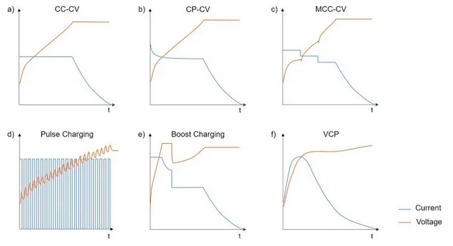 CCCV是目前最常見的充電協(xié)議,即先恒流充電至截止電壓(CC階段),再恒壓充至接近0的小電流(CV階段)。恒壓過程可以使電極材料內(nèi)的離子濃度分布更均勻,對于材料發(fā)揮出高比容量至關(guān)重要;但恒壓時的電流逐漸減小,使CV的充電時間明顯比CC長。CC-CV充電模式的簡單可操作性使其成為最廣泛應(yīng)用的標(biāo)準(zhǔn)充電協(xié)議。但是很多其他重點(diǎn)策略可以減少充電時間、提高充電效率、提高容量/功率保持率。圖8展示了幾種常見的快充策略曲線。