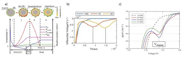a)CC-CV充電和靜置過程中的過電勢變化模擬。階段I,負(fù)極顆粒上沒有鋰沉積;階段II,鋰沉積開始發(fā)生;階段III,部分可逆的鋰重新嵌入負(fù)極或溶出,剩余的變成死鋰;階段IV,平衡態(tài),死鋰不再參與后續(xù)循環(huán);b) 電壓微分分析(DVA);c)微分容量分析(ICA)