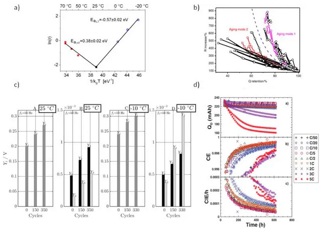 無損的析鋰觀測技術(shù)對于實際的電池應(yīng)用很重要。一般可用于析鋰表征的檢測包括SEM,TEM,NMR和XRD等,但這些手段都需要對電池進(jìn)行破壞或使用特殊電池構(gòu)型。常用的無損析鋰觀測利用電池的外部特性,包括老化速率,鋰回嵌的電壓平臺,模型預(yù)測等方法。如圖6所示,基于老化特征的析鋰檢測手段包括(a)阿倫尼烏斯方程,(b)衰減過程的容量和阻抗變化分析,(c)非線性頻域響應(yīng)分析和(d)庫倫效率分析。