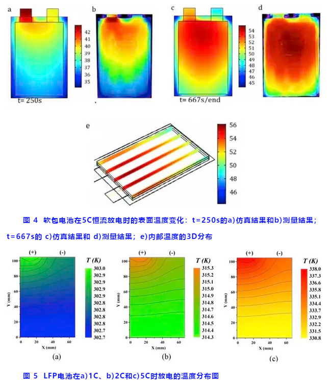 鋰離子電池中,軟包、圓柱、方殼電池的熱量分布與散失是不均勻分布的:例如一些電池材料的面導(dǎo)熱能力較差,因此其熱量相對于表面會更多積累在核心位置。此外,電流密度和產(chǎn)熱速率在電池不同位置也不相同。這些不一致性在大尺寸電池上被進(jìn)一步放大。如圖3所示,圓柱電池內(nèi)部中心的溫度要明顯高于表面。對于軟包或方型電池而言,如圖4和圖5所示,極耳處的溫度要明顯高于其他位置。此外,由于正極鋁集流體比負(fù)極銅集流體的電阻更大,正極極耳溫度常高于負(fù)極極耳。