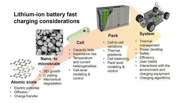 盡管提高電動車充電功率的研究已有較大進(jìn)展,但這些快充技術(shù)并不在所有情況下適應(yīng)。根據(jù)電動車的特定工況和充電環(huán)境,持續(xù)充電過程中,充電功率會逐漸衰減。此外,快充模式下,由于安全等因素限制,電池通常只能充至80%的電量;更高電量下,充電倍率會逐漸減小以避免過充。此外,充電功率還受到電池管理系統(tǒng)(BMS)的限制。工業(yè)界對電池快充領(lǐng)域的興趣越來越濃厚,理解清楚不同充電方法的決速步驟及其對電池壽命的影響十分必要。本文旨在從快速充電的多尺度和多學(xué)科特性出發(fā),建立微觀過程、材料特性、電池及Pack設(shè)計和充電策略優(yōu)化之間的聯(lián)系。