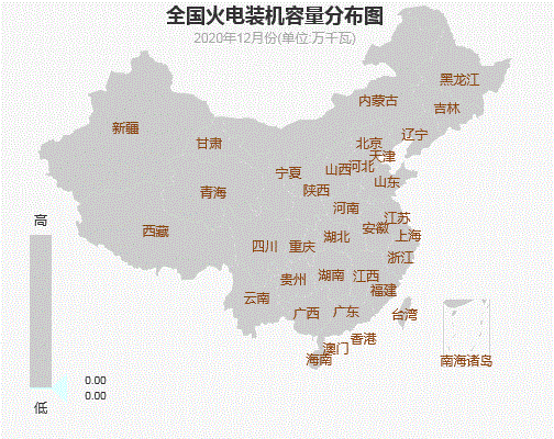 2020年,全國全口徑火電裝機容量達(dá)124517萬千瓦,同比增長4.7%,占全部裝機容量的56.58%。其中,煤電裝機容量為107992萬千瓦,同比增長3.8%,占全部裝機容量的49.07%,首次降至50%以下;氣電裝機容量為9802萬千瓦,同比增長8.6%,全部裝機容量的4.45%。全國火電裝機容量分布圖如下所示。