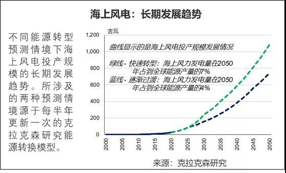 克拉克森研究的長期預(yù)測表明,海上可再生能源將在全球能源結(jié)構(gòu)綠色低碳轉(zhuǎn)型的大趨勢中扮演重要角色。源于克拉克森研究能源轉(zhuǎn)換模型提供的兩種預(yù)測情境 – “逐步過渡轉(zhuǎn)換”和“快速去碳化轉(zhuǎn)換”,海上風(fēng)電占全球能源產(chǎn)量的份額將從當(dāng)前的0.2%增至21世紀(jì)中期的4%到7%。截至2030年,海上風(fēng)力年發(fā)電量將增長7到11倍,超過544太瓦時(shí)。