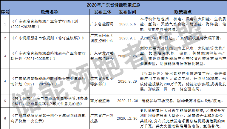 當(dāng)然,廣東省儲(chǔ)能產(chǎn)業(yè)的蓬勃發(fā)展,離不開儲(chǔ)能政策的推動(dòng)。據(jù)EESA不完全統(tǒng)計(jì),2020年廣東省共頒布6條與儲(chǔ)能相關(guān)性地方政策,通過地方性政策明確支持新能源與儲(chǔ)能的一體化建設(shè)。
