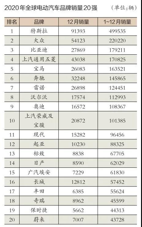 比亞迪在品牌銷量榜跌至第3名,不過(guò)這也是該品牌連續(xù)6年躋身前三。上汽通用五菱躍升至第4,寶馬則跌至第5。榜單第6名奔馳2021年將推出多款全新電動(dòng)車型,例如EQA、EQB和EQS純電動(dòng)車,預(yù)計(jì)今年該品牌有潛力擊敗其德國(guó)競(jìng)爭(zhēng)對(duì)手奧迪和寶馬,躋身前五。值得一提的是,在品牌銷量20強(qiáng)榜單中,有16個(gè)品牌去年12月的銷量均創(chuàng)下新紀(jì)錄,除了上述提及的品牌,還有上汽集團(tuán)旗下兩大自主品牌——榮威及寶駿,當(dāng)月售出逾2萬(wàn)輛電動(dòng)汽車。另外,得益于去年12月8962輛的銷量成績(jī),奇瑞的年度總排名上升至第18位。日產(chǎn)去年12月售出8590輛電動(dòng)汽車,是自2018年11月以來(lái)的最佳月度銷量,總排名上升至第14位。保時(shí)捷和蔚來(lái)也憑借去年12月的創(chuàng)紀(jì)錄銷量,2020年總排名躋身前20。