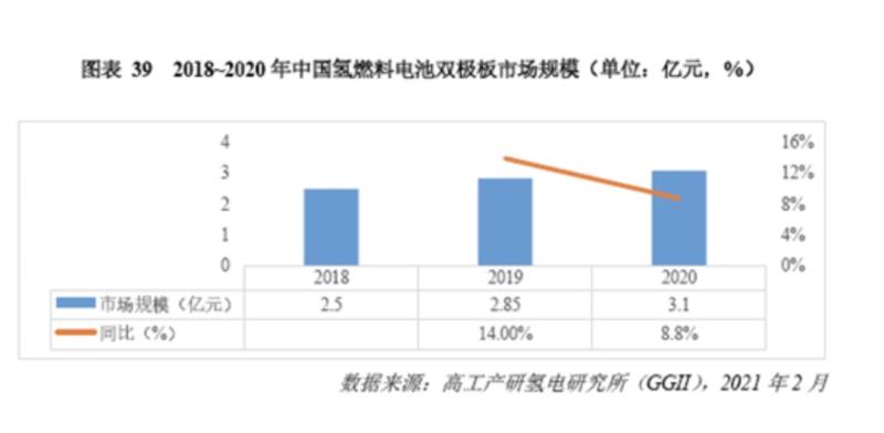 近日,高工產(chǎn)研氫電研究所(GGII)正式發(fā)布的《2021年中國氫電產(chǎn)業(yè)發(fā)展藍(lán)皮書(1.0版)》顯示,2020年國內(nèi)氫燃料電池雙極板市場規(guī)模約為3.1億元,同比增長8.8%,增長的主要原因是2020年國內(nèi)外電堆出貨量的增長。
