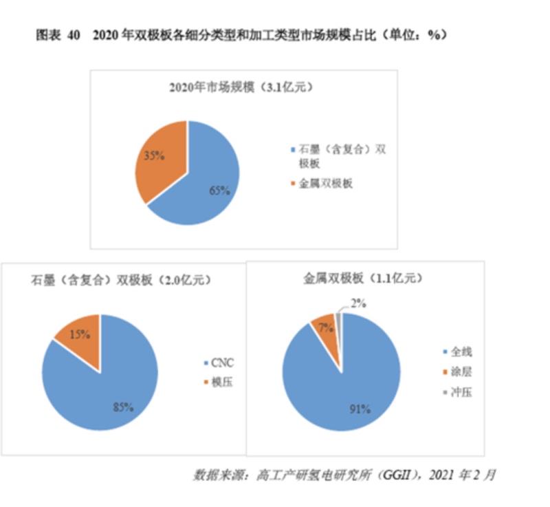 從雙極板的加工工藝來看,現(xiàn)階段石墨雙極板的加工形式有CNC和模壓兩種,2020年采用CNC工藝路線的石墨雙極板市場規(guī)模占比達(dá)到85%,仍是當(dāng)下的主流;另一方面,采用模壓工藝的石墨雙極板市場占比從2019年的不足10%,提升到15%左右,有了顯著的增長。