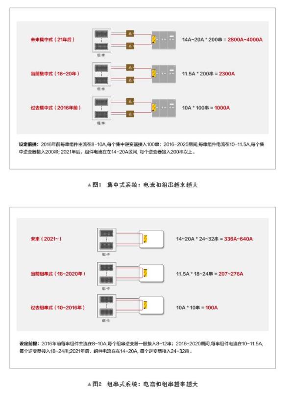1)為進(jìn)一步降低光伏電站LCOE,光伏組件呈現(xiàn)大功率、大電流趨勢(shì)。隨著硅片尺寸越來(lái)越大以及電池效率越來(lái)越高,組件電流不斷提高成為必然趨勢(shì)。我們看到,組件電流越來(lái)越大,逆變器功率或匯流箱對(duì)應(yīng)的組串?dāng)?shù)量也不斷增加。